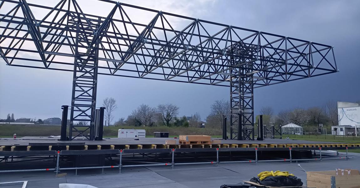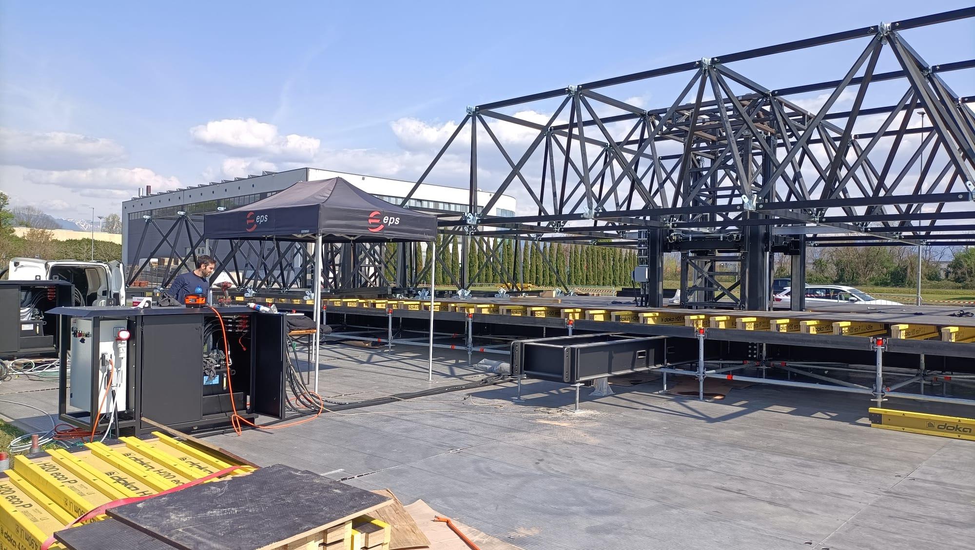 EPS Italia, an international reference in event infrastructure – supporting over 5,000 events every year – has developed a synchronized lifting system for the assembly and dismantling of truss structures for stage roofing.